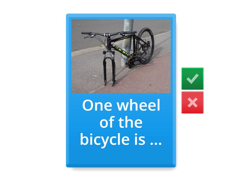The DC is ... - scratched, The nail is ... - bent, The chair is ... - broken, The pocket is ... - torn, The wall is ... - cracked, The car is ... - dented, The shoes are ... - worn, The toilet is ... - leaking, This box is ... - crushed, One wheel of the bicycle is ... - missing,