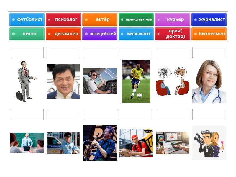 дизайнер, преподаватель, бизнесмен, врач( доктор), актёр, психолог, футболист, музыкант, журналист, пилот, полицейский, курьер,