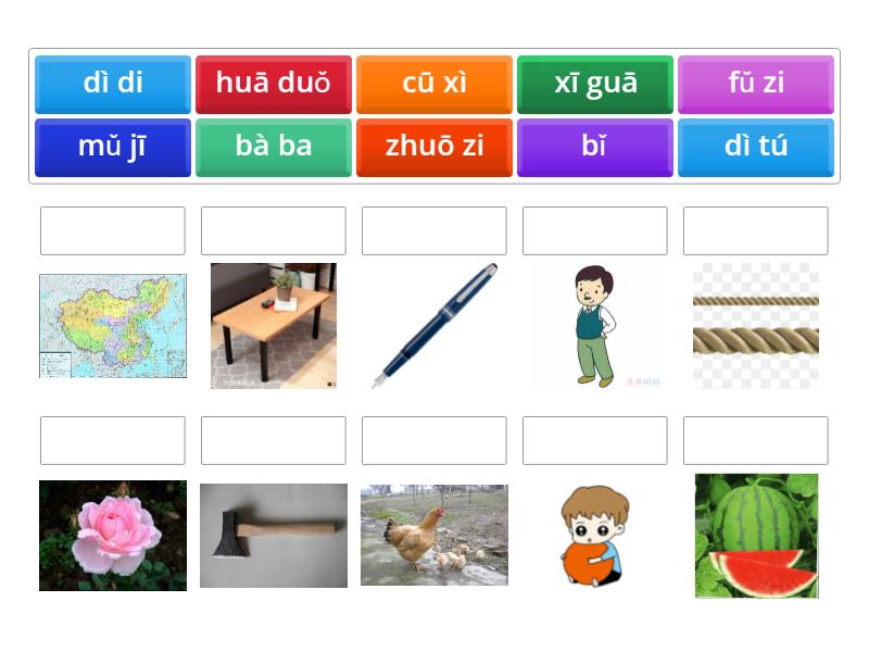 bà ba, mā ma, dì di, pù bù, bá hé, fǔ zi, dì tú, gē qǔ, è yú, bō luó, luò tuo, wū yā, jú zi, mǎ yǐ, mǔ jī, bǐ, dà mǐ, xī guā, huā duǒ, yī fu, yā zi, ní ba, kě lè, qì qiú, zǐ sè, cū xì, zhū, chǐ zi, zhuō zi, chā zi,