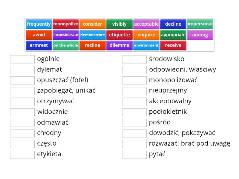 dilemma - dylemat, etiquette - etykieta, receive - otrzymywać, enquire - pytać, demonstrate - dowodzić, pokazywać, consider - rozważać, brać pod uwagę, frequently - często, acceptable - akceptowalny, appropriate - odpowiedni, właściwy, on the whole - ogólnie, among - pośród, impersonal - chłodny, inconsiderate - nieuprzejmy, environment - środowisko, recline - opuszczać (fotel), monopolize - monopolizować, armrest - podłokietnik, avoid - zapobiegać, unikać, visibly - widocznie, decline - odmawiać,