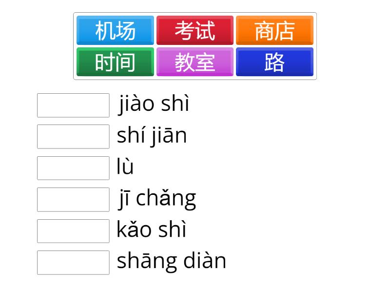 考试 - kǎo shì, 商店 - shāng diàn , 机场 - jī chǎng , 路 - lù, 教室 - jiào shì, 时间 - shí jiān,