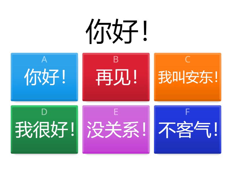 1) 你好! a) 你好! b) 再见! c) 我叫安东! d) 我很好! e) 没关系! f) 不客气! 2) 再见! a) 你好! b) 再见! c) 我叫安东! d) 我很好! e) 没关系! f) 不客气! 3) 你叫什么名字? a) 没关系! b) 我很好! c) 不客气! d) 再见! e) 你好! f) 我叫安东! 4) 谢谢! a) 不客气! b) 你好! c) 我叫安东! d) 再见! e) 我很好! f) 没关系! 5) 对不起! a) 不客气! b) 你好! c) 我叫安东! d) 再见! e) 我很好! f) 没关系! 6) 你好吗? a) 不客气! b) 你好! c) 我叫安东! d) 再见! e) 我很好! f) 没关系!