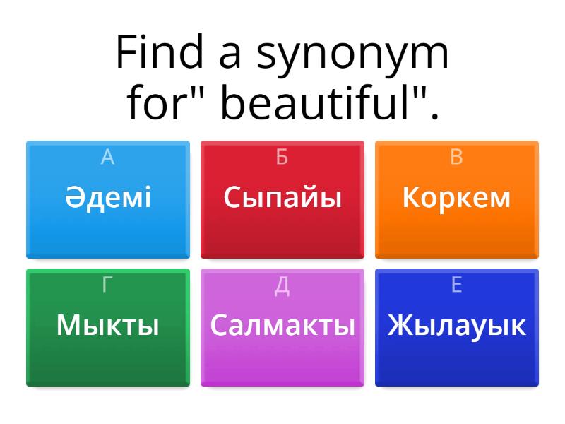 1) Find a synonym for" beautiful". a) Әдемі b) Сыпайы c) Коркем d) Мыкты e) Салмакты f) Жылауык 2) Complete the given sentence correctly. October 25 -.. a) Ұлы Отан Соғысы b) Аналар күні c) Республика күні d) Ардагерлер күні e) Тәуелсіздік күні f) Жаңа жыл 3) What is the correct translation for "railway" a) теміржол b) әуежай c) тікұшақ d) аспан 4) What is the correct translation for "pen" a) қарандаш b) қолшатыр c) қалам d) сағат 5) What is the correct translation for"Unified national test" a) ТМД b) ҰБТ c) БҰҰ d) ҚР 6) Find the word with the soft (front) consonants. a) інім b) адам c) бала d) қала 7) Find the opposites. a) қып-қызыл b) үлкен-кішкентай c) айдын-айқын d) қап-қара 8) Find the questions of "Шығыс септік "(ablative case) a) кімнен? неден? b) кіммен?немен? c) кімге?неге? d) кім?не?