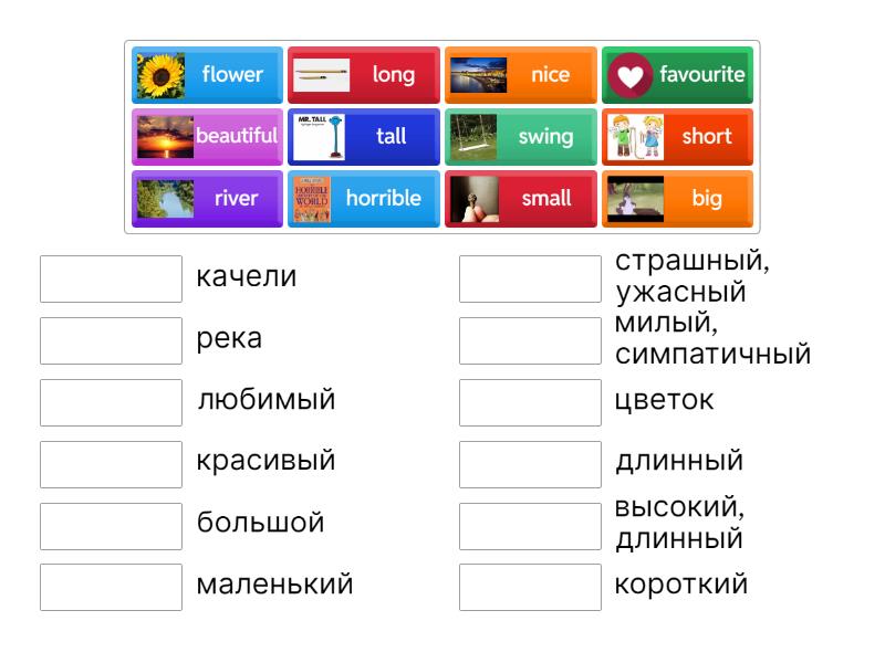 river - река, flower - цветок, swing - качели, favourite - любимый, beautiful - красивый, big - большой, small - маленький, short - короткий, long - длинный, nice - милый, симпатичный, horrible - страшный, ужасный, tall - высокий, длинный,
