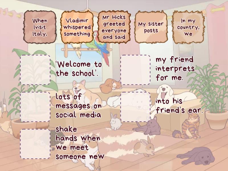 In my country, we - shake hands when we meet someone new, Vladimir whispered something - into his friend’s ear., My sister posts - lots of messages on social media, Mr Hicks greeted everyone and said - ‘Welcome to the school’., When Ivisit Italy, - my friend interprets for me.,