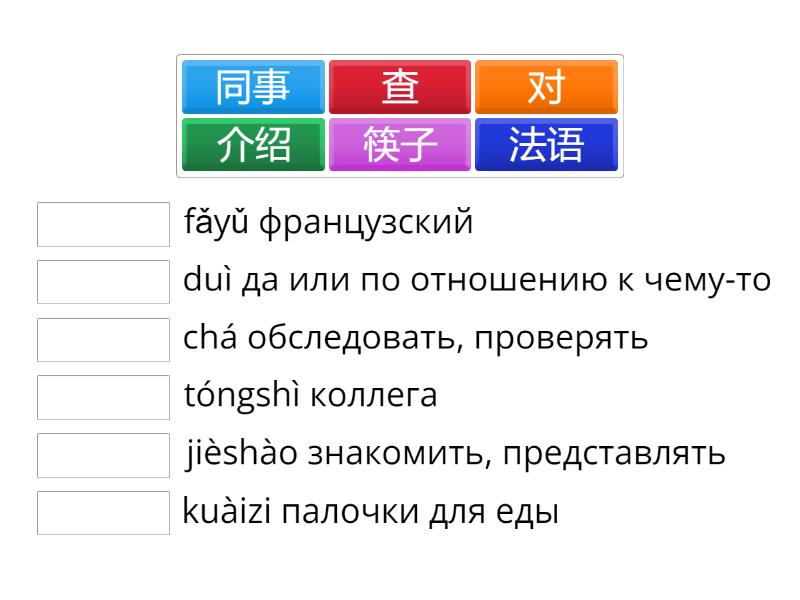 客人 - kèrén гость, посетитель, клиент , 介绍 - jièshào знакомить, представлять , 公司 - gōngsī фирма, компания , 认识 - rènshi знать, быть знакомым, 同事 - tóngshì коллега, 输入 - shūrù вводить , 电脑 - diànnǎo компьютер, ноутбук, 查 - chá обследовать, проверять , 法 - fǎ закон или метод, 筷子 - kuàizi палочки для еды , 对 - duì да или по отношению к чему-то, 法语 - fǎyǔ французский ,