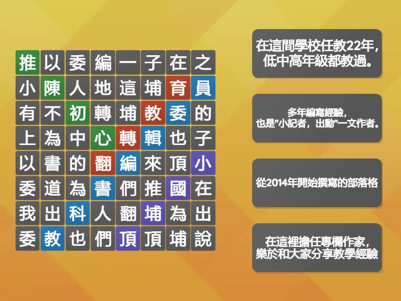 推陳初心 - 從2014年開始撰寫的部落格, 頂埔國小 - 在這間學校任教22年, 低中高年級都教過。, 翻轉教育 - 在這裡擔任專欄作家, 樂於和大家分享教學經驗, 教科書編輯委員 - 多年編寫經驗, 也是"小記者,出動"一文作者。,