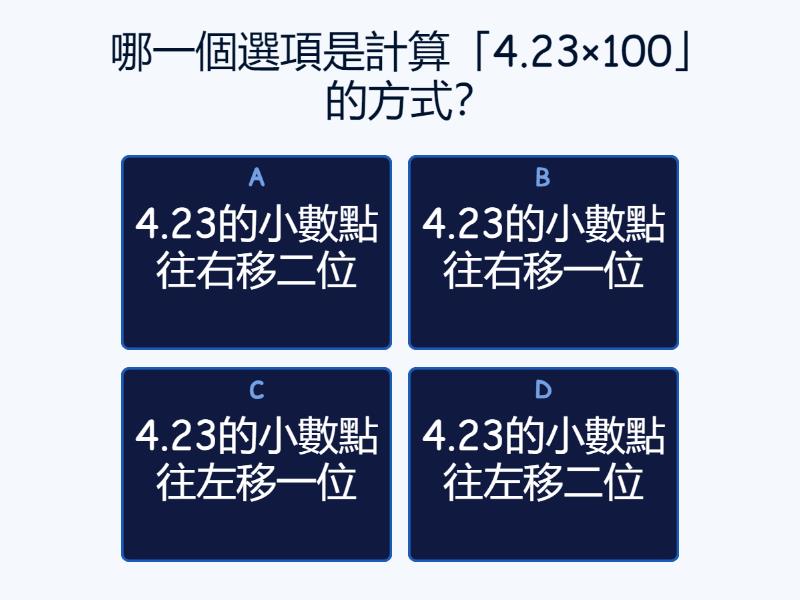 1) 0.008的10倍是多少? a) 0.008 b) 0.08 c) 0.8 d) 8 2) 哪一個選項是計算「4.23×100」 的方式? a) 4.23的小數點 往右移一位 b) 4.23的小數點 往右移二位 c) 4.23的小數點 往左移一位 d) 4.23的小數點 往左移二位