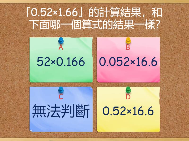 1) 一公斤的葡萄賣82.5元,阿姨買了 4.4公斤,共要付多少元? a) 333元 b) 363元 c) 660元 d) 3630元 2) 「0.156×2.989」的計算結果, 會有幾位小數? a) 5位 b) 6位 c) 7位 d) 8位 3) 「0.01×0.0001」的計算結果,和 下面哪一個算式的結果一樣? a) 0.001×0.001 b) 0.001×0.1 c) 0.001×0.0001 d) 0.1×0.0001 4) 3.45的0.1倍是多少? a) 0.345 b) 3.45 c) 34.5 d) 345 5) 「0.52×1.66」的計算結果,和 下面哪一個算式的結果一樣? a) 52×0.166 b) 0.52×16.6 c) 0.052×16.6 d) 無法判斷