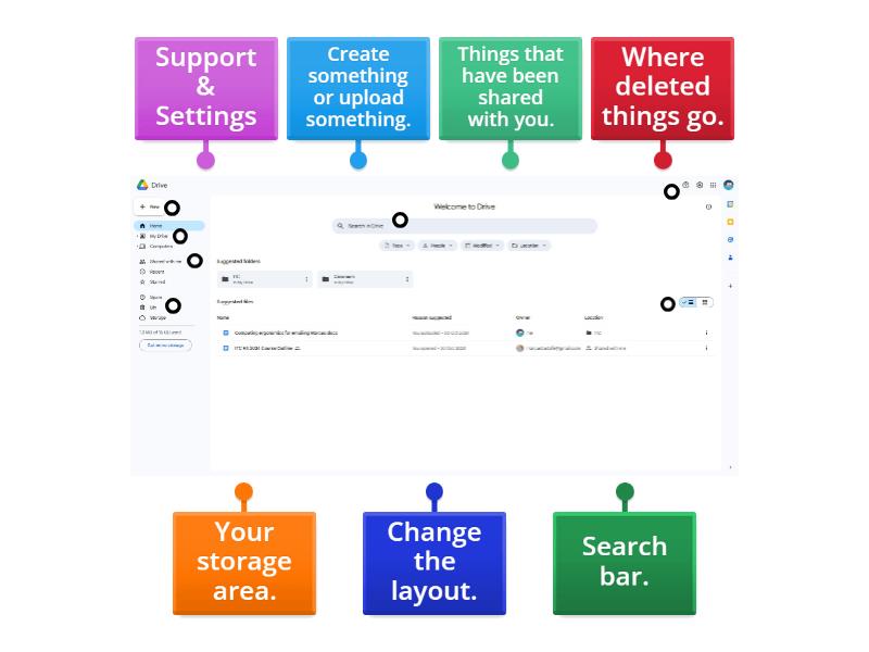 Create something or upload something., Where deleted things go., Your storage area., Search bar., Support & Settings, Change the layout., Things that have been shared with you..