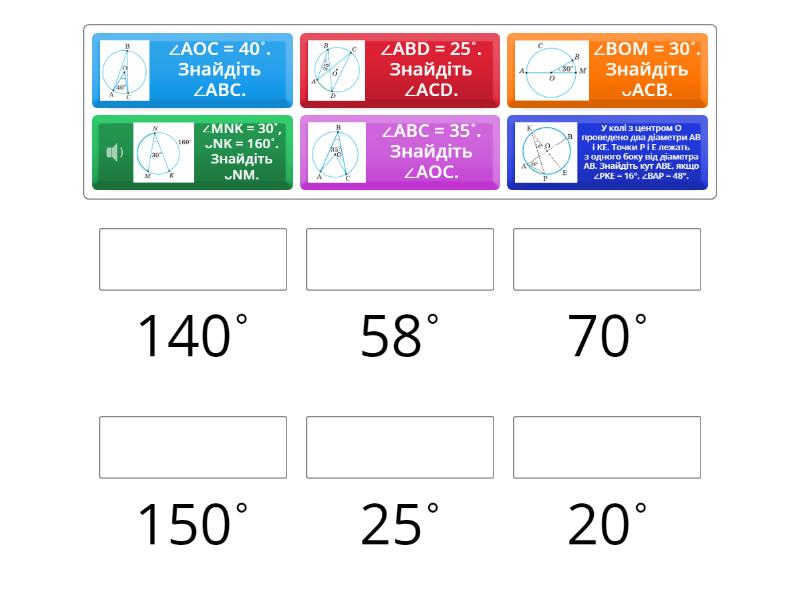 ∠АВС = 35˚. Знайдіть ∠АОС. - 70˚, ∠АОС = 40˚. Знайдіть ∠АВС. - 20˚, ∠МNK = 30˚, ᴗNK = 160˚. Знайдіть ᴗNM. - 140˚, ∠АВD = 25˚. Знайдіть ∠АСD. - 25˚, ∠ВОМ = 30˚. Знайдіть ᴗАСВ. - 150˚, У колі з центром О проведено два діаметри АВ і КЕ. Точки Р і Е лежать з одного боку від діаметра АВ. Знайдіть кут АВЕ, якщо ∠PKE = 16°, ∠ВАР = 48°. - 58˚,