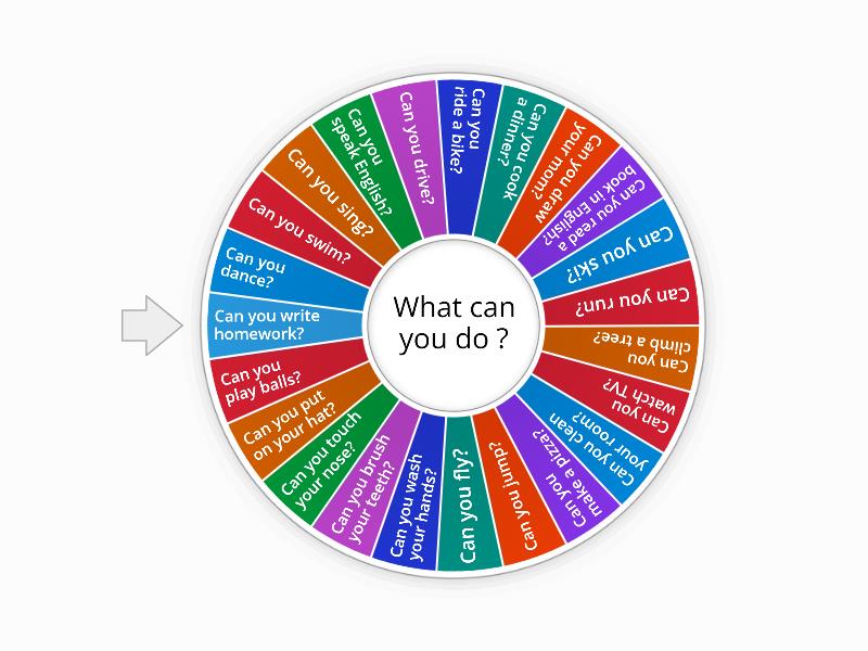 Can you dance?, Can you swim?, Can you sing?, Can you speak English?, Can you drive?, Can you ride a bike?, Can you cook a dinner?, Can you draw your mom?, Can you read a book in English?, Can you ski?, Can you run?, Can you climb a tree?, Can you watch TV?, Can you clean your room?, Can you make a pizza?, Can you jump?, Can you fly?, Can you wash your hands? , Can you brush your teeth? , Can you touch your nose? , Can you put on your hat? , Can you play balls? , Can you write homework?.