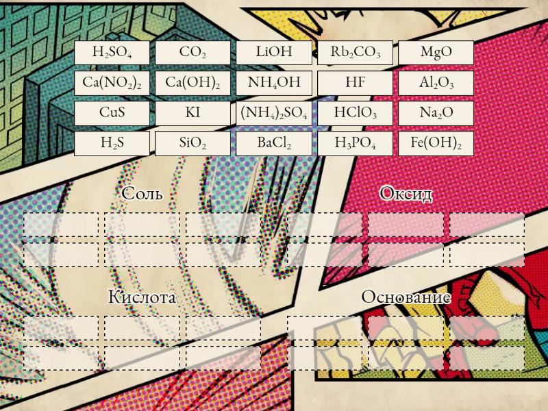Соль : KI, (NH4)2SO4, BaCl2, Ca(NO2)2, CuS , Rb2CO3, Оксид : Na2O, CO2, Al2O3, SiO2, MgO, Кислота: H2SO4, H2S, HF , H3PO4, HClO3, Основание : LiOH, Ca(OH)2, Fe(OH)2 , NH4OH,