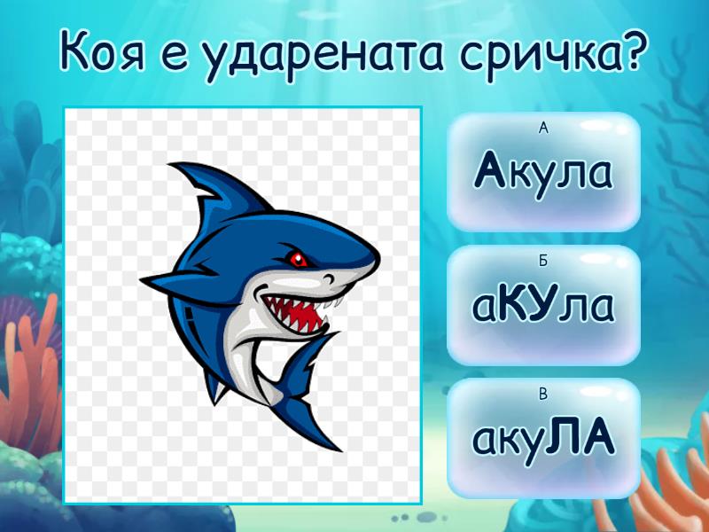 1) Коя е ударената сричка? a) Акула b) аКУла c) акуЛА 2) Коя е ударената сричка? a) АВтобус b) авТОбус c) автоБУС 3) Коя е ударената сричка? a) баНАН b) БАнан 4) Коя е ударената сричка? a) ДИнозавър b) диНОзавър c) диноЗАавър d) динозаВЪР 5) Коя е ударената сричка? a) ДИректор b) диРЕКтор c) дирекТОР 6) Коя е ударената сричка? a) ЕДнорог b) едНОрог c) едноРОГ 7) Коя е ударената сричка? a) каМИла b) КАмила c) камиЛА 8) Коя е ударената сричка? a) КАтерица b) каТЕрица c) катеРИца 9) Коя е ударената сричка? a) КОла b) коЛА 10) Коя е ударената сричка? a) КОСтенурка b) костеНУРка c) косТЕнурка 11) Коя е ударената сричка? a) КРАва b) краВА 12) Коя е ударената сричка? a) МАЙмуна b) майМУна c) маймуНА 13) Коя е ударената сричка? a) МОмиче b) моМИче 14) Коя е ударената сричка? a) ПАЛма b) палМА 15) Коя е ударената сричка? a) поЖАРникар b) пожарНИкар c) пожарниКАР 16) Коя е ударената сричка? a) ПОлицай b) поЛИцай c) полиЦАЙ 17) Коя е ударената сричка? a) ПРОчети b) проЧЕти c) прочеТИ 18) Коя е ударената сричка? a) проЗОрец b) прозоРЕЦ 19) Коя е ударената сричка? a) РИба b) риБА 20) Коя е ударената сричка? a) САмолет b) саМОлет c) самоЛЕТ 21) Коя е ударената сричка? a) Учител b) уЧИтел c) учиТЕЛ 22) Коя е ударената сричка? a) Ябълки b) яБЪЛки c) ябълКИ