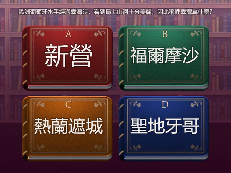 1) 歐洲葡萄牙水手經過臺灣時,看到島上山河十分美麗,因此稱呼臺灣為什麼? a) 新營 b) 福爾摩沙 c) 熱蘭遮城 d) 聖地牙哥 2) 四百多年前,歐洲國家積極到海外探險,透過新航路來到亞洲,目的是為了尋找東方的什麼物品? a) 鹿皮、茶葉 b) 木材、蔗糖 c) 瓷器、絲織品 d) 稻米、漁獲 3) 鄭經過世後,內部因爭奪政權而紛爭不斷,清帝國趁機派下列哪一個人進攻臺灣? a) 施琅 b) 陳永華 c) 顏思齊 d) 朱一貴 4) 鄭氏政權在臺期間積極推動教育事業,因此興建了什麼? a) 熱蘭遮城 b) 紅毛城 c) 孔子廟 d) 教堂 5) 下列哪一項不是 荷蘭人在臺期間所帶來的影響? a) 招募漢人來臺開墾 b) 傳教士傳入玄天上帝、媽祖等信仰 c) 傳播基督教 d) 引進西方的建築技術 6) 清帝國統治後期,下列哪一個外國人主要以外交官身分來到臺灣呢? a) 斯文豪 b) 馬雅各 c) 湯姆生 d) 馬偕 7) 沈葆楨奉命來臺,是由於發生什麼事情? a) 林爽文事件 b) 牡丹社事件 c) 郭懷一事件 d) 清法戰爭 8) 清帝國於西元 1860 年代開放臺 灣四個港口與外國人通商,請問 下列哪一個港口不在開放的範圍呢? a) 鹿港 b) 安平 c) 雞籠 d) 淡 水 9) 臺灣獨立建省之前,隸屬於哪個省所管轄? a) 廣東省 b) 江蘇省 c) 福建省 d) 浙江省 10) 我國現今的離島數量不包括下列哪一個地方? a) 綠島 b) 沖繩島 c) 龜山島 d) 蘭嶼