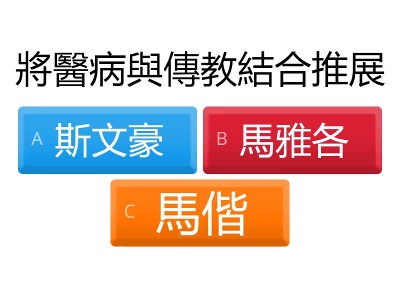 1) 將醫病與傳教結合推展 a) 斯文豪 b) 馬雅各 c) 馬偕 2) 建立淡水女學堂,提倡女子教育 a) 斯文豪 b) 馬雅各 c) 馬偕 3) 建立臺灣第一座西式醫館 a) 斯文豪 b) 馬雅各 c) 馬偕 4) 調查臺灣動植物 a) 斯文豪 b) 馬雅各 c) 馬偕 5) 建立理學堂大書院,傳授現代教育科目 a) 斯文豪 b) 馬雅各 c) 馬偕 6) 以拔牙方式傳教 a) 斯文豪 b) 馬雅各 c) 馬偕 7) 發表研究報告,為許多動植物命名 a) 斯文豪 b) 馬雅各 c) 馬偕
