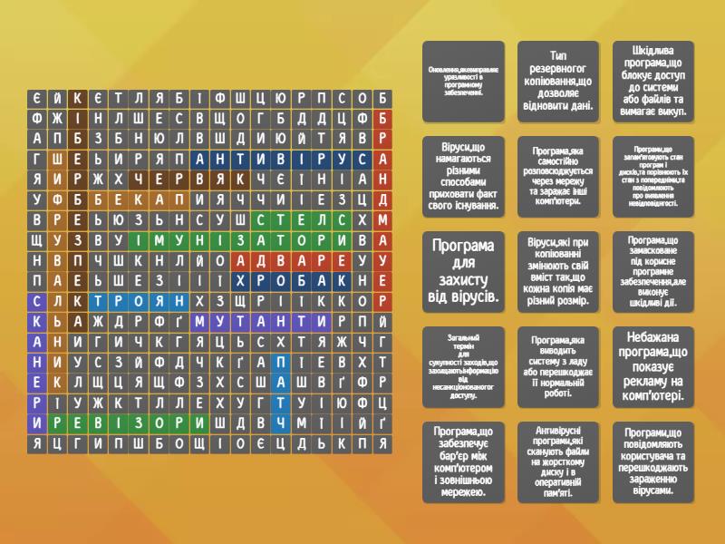 Ревізори - Програми,що запам'ятовують стан програм і дисків,та порівнюють їх стан з попередніми,та повідомлюють про виявлення невідповіднгості., Мутанти - Віруси,які при копіюванні змінюють свій вміст так,що кожна копія має різний розмір., Брандмауер - Програма,що забезпечує бар'єр між комп'ютером і зовнішньою мережею., Патч - Оновлення,якевиправляє уразливості в програмному забезпеченні., Червяк - Програма,яка виводить систему з ладу або перешкоджає її нормальній роботі., Хробак - Програма,яка самостійно розповсюджується через мережу та заражає інші комп'ютери. , Бекап - Тип резервногог копіювання,що дозволяє відновити дані., Імунізатори - Програми,що повідомляють користувача та перешкоджають зараженню вірусами., Сканери - Антивірусні програми,які сканують файли на жорсткому диску і в оперативній пам'яті., Адваре - Небажана програма,що показує рекламу на комп'ютері., Троян - Програма,що замасковане під корисне програмне забезпечення,але виконує шкідливі дії., Кібербезпека - Загальний термін для сукупності заходів,що захищаютьінформацію від несанкціонованогог доступу., Антивірус - Програма для захисту від вірусів., Шифрувальник - Шкідлива програма,що блокує доступ до системи або файлів та вимагає викуп., Стелс - Віруси,що намагаються різними способами приховати факт свого існування.,