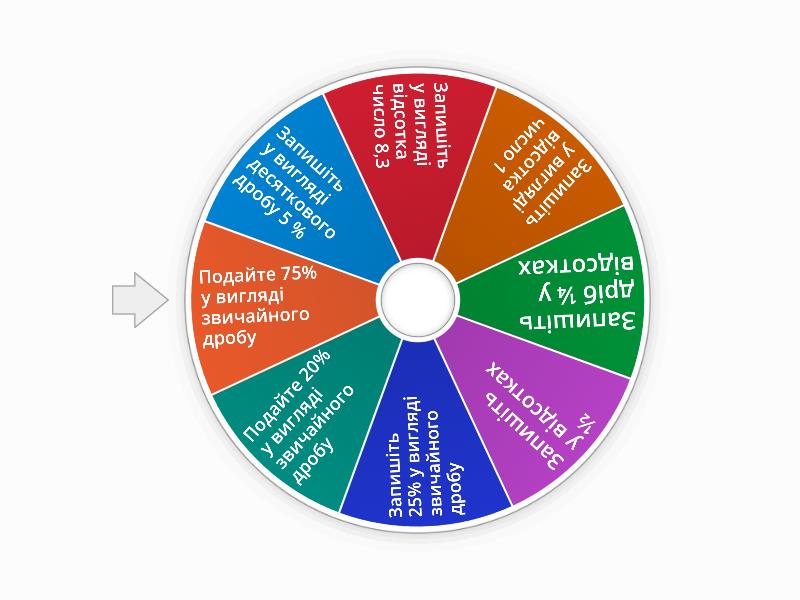 1) Запишіть у вигляді десяткового дробу 5 % 2) Запишіть у вигляді відсотка число 8,3 3) Запишіть у вигляді відсотка число 1 4) Запишіть дріб ¼ у відсотках 5) Запишіть у відсотках ½ 6) Запишіть 25% у вигляді звичайного дробу 7) Подайте 20% у вигляді звичайного дробу 8) Подайте 75% у вигляді звичайного дробу