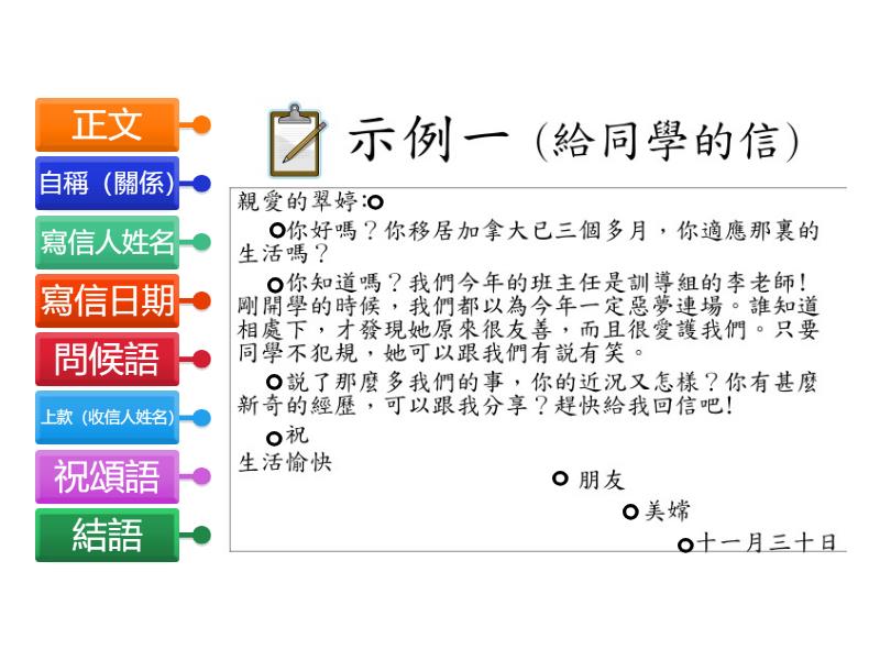 上款(收信人姓名), 問候語, 正文, 結語, 祝頌語, 自稱(關係), 寫信人姓名, 寫信日期.