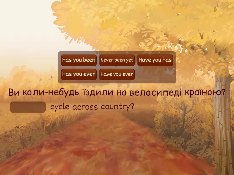 Ви коли-небудь їздили на велосипеді країною? ____ cycle across country? Have you ever ____ a place in a helicopter? Ви колись ходили в похід? Have you ever ____? Ви коли-небудь подорожували в автофургоні? Have you ever travel in a ____? Have you ever ____ an elephant? Have you ever sail on a ____ ? Ви їздили на квадроциклі? Have you ever drive a ____ ? Have you ever go sightseeing on an ____?