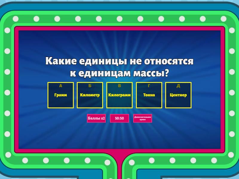 1) Какие единицы не относятся к единицам массы? a) Грамм b) Километр c) Килограмм d) Тонна e) Центнер 2) Вырази в граммах: 2 кг 15 г a) 215 г b) 2015 г c) 20150 г 3) Сравни величины: 645 т ... 645 000 кг a) < b) > c) = 4) Вырази в кг 12 ц 2 кг a) 1320 кг b) 122 кг c) 1203 кг d) 1232 кг 5) Во сколько раз 10 кг меньше, чем 1 тонна? a) 10 b) 100 c) 1000