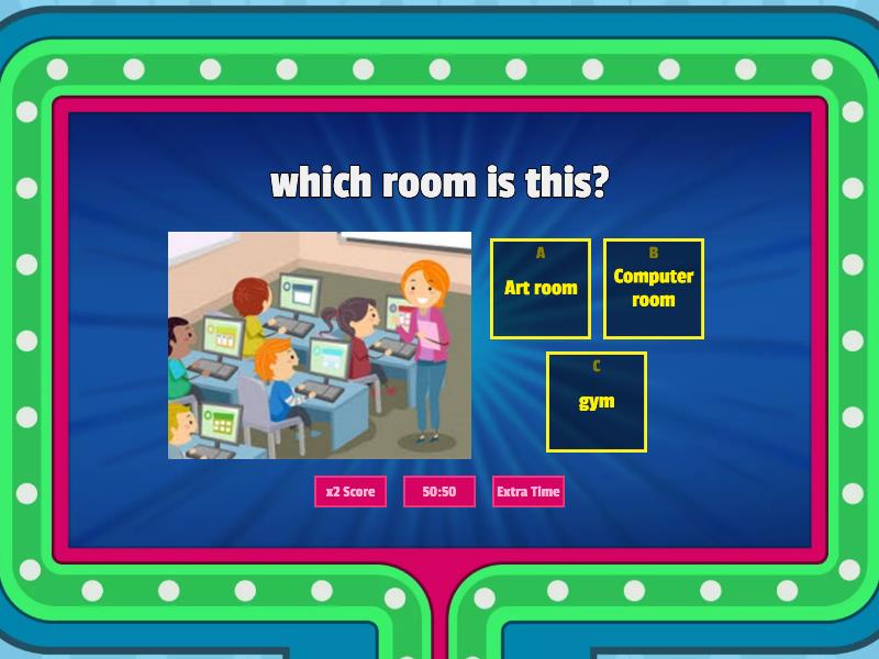1) which room is this? a) Art room b) Computer room c) gym 2) which room is this ? a) playground b) Sports field c) Art room 3) which place is this ? a) Gym b) classroom c) sports field 4) which room is this? a) Art room b) computer room c) classroom 5) which place is this ? a) playground b) gym c) classroom