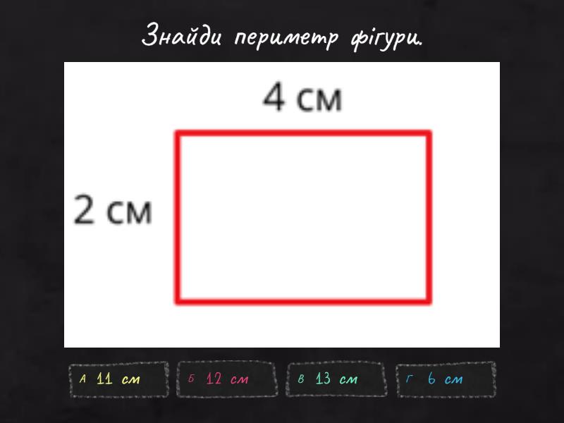 1) Знайди периметр фігури. a) 11 см b) 12 см c) 13 см d) 6 см 2) Знайди периметр фігури. a) 10 см b) 20 см c) 12 см d) 7 см 3) Знайди периметр фігури. a) 8 см b) 7см c) 6 см d) 4 см 4) Знайди периметр фігури. a) 5 см b) 6 см c) 7 см d) 10 см 5) Знайди периметр фігури. a) 10 см b) 12 см c) 13 см d) 9 см 6) Знайди периметр фігури. a) 15 см b) 14 см c) 10 см d) 5 см 7) Знайди периметр фігури. a) 14 см b) 16 см c) 8 см d) 4 см