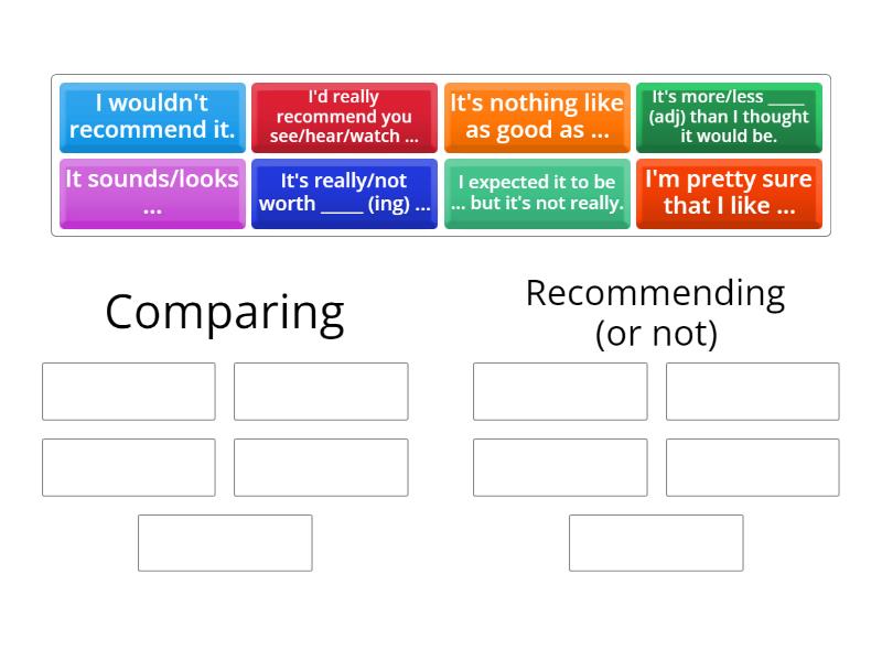 Comparing: It's nothing like as good as ..., I expected it to be ... but it's not really., It's more/less _____ (adj) than I thought it would be., Recommending (or not): I'd really recommend you see/hear/watch ..., I wouldn't recommend it., I'm pretty sure that I like ..., It's really/not worth _____ (ing) ..., It sounds/looks ...,