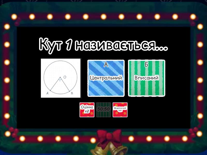 1) Кут 1 називається... a) Центральний b) Вписаний 2) Кут 2 називається... a) Центральний b) Вписаний 3) Кут 1 і кут 2 рівні? a) Ні b) Так 4) Кут 1 дорівнює... a) 80° b) 160° c) 40° d) 100° 5) Чи вірний малюнок? a) Так b) Ні 6) Кут 1 дорівнює... a) 10° b) 20° c) 40° d) 80° 7) Градусна міра виділеної дуги дорівнює... a) 50° b) 100° c) 60° d) 25° 8) Градусна міра виділеної дуги дорівнює... a) 15° b) 30° c) 60° d) 80° 9) Виділена дуга дорівнює... a) 260° b) 160° c) 300° d) 220° 10) Кут 1 центральний? a) Так b) Ні 11) Кут 1 дорівнює... a) 60° b) 30° c) 90° d) 180°