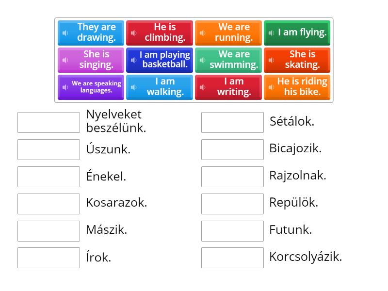 I am flying. - Repülök., We are running. - Futunk., He is climbing. - Mászik., They are drawing. - Rajzolnak., We are speaking languages. - Nyelveket beszélünk. , I am playing basketball. - Kosarazok. , I am writing. - Írok. , I am walking. - Sétálok. , We are swimming. - Úszunk., She is skating. - Korcsolyázik., She is singing. - Énekel., He is riding his bike. - Bicajozik.,