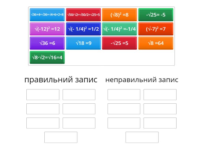правильний запис: √36 =6, √8·√2=√16=4, √50/√2=√50/2=√25=5, √(-12)2 =12, (√8)2 =8, -√25= -5, неправильний запис: √18 =9, √(- 1/4)2 =1/2, √(- 1/4)2 =-1/4, √36+4=√36+√4=6+2=8, (√-7)2 =7, -√25 =5, √8 =64,