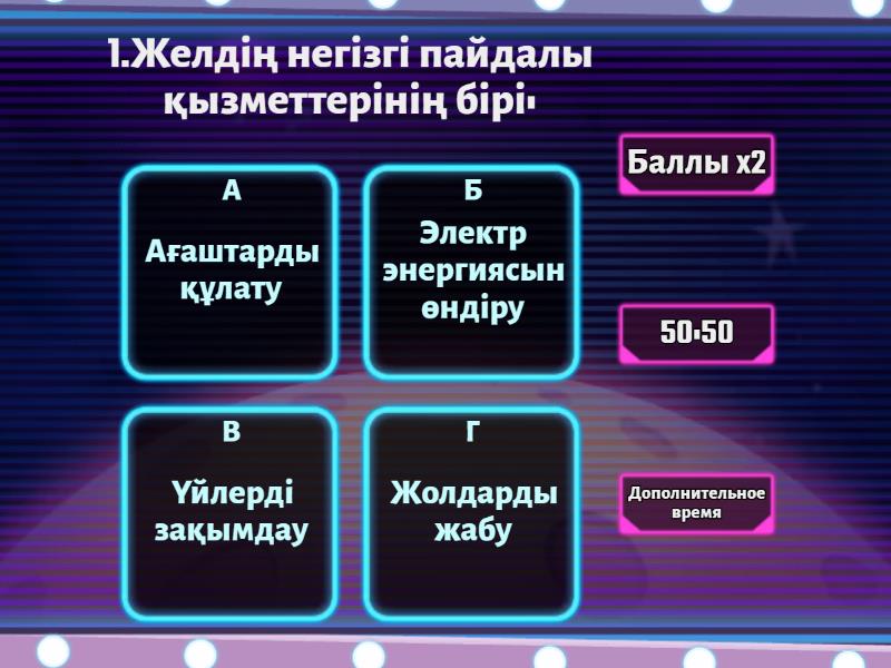 1) 1.Желдің негізгі пайдалы қызметтерінің бірі: a) Ағаштарды құлату b) Электр энергиясын өндіру c) Үйлерді зақымдау d) Жолдарды жабу 2) Желдің жылдамдығын өлшейтін құрал қалай аталады? a) Анемометр b) Барометр c) Гигрометр d) Термометр 3) Желдің зиянды әсерлерінің бірі? a) Желкенді кемелерді қозғалысқа келтіру b) Өсімдіктерге тозаң тарату c) Табиғи апаттар туғызу d) Жел диірмендерін іске қосу 4) Желдің қандай түрі электр энергиясын өндіруге қолданылады? a) Дауыл b) Қатты боран c) Тұрақты жел d) Құйын 5) Желден алынатын энергия қалай аталады? a) Гидроэнергия b) Жел энергиясы c) Күн энергиясы d) Ядролық энергия 6) Жел диірмендері көбінесе қайда орналасады? a) Таулы аймақтарда b) Қаланың ішінде c) Қалың ормандарда d) Тегіс және ашық жерлерде 7) Желдің көмегімен адамзат ертеде нені іске асырған? a) Желкенді кемелермен саяхат b) Құрылыс жұмыстарын c) Су тасымалдау d) Электр қуатын өндіру 8) Желдің жылдамдығы көбінесе қай уақытта күшейеді? a) Таңертең b) Түсте c) Кешке d) Көктемде немесе күзде дауылды ауа райында