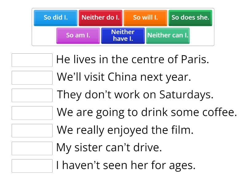 So did I. - We really enjoyed the film., Neither have I. - I haven’t seen her for ages., Neither can I. - My sister can’t drive., So does she. - He lives in the centre of Paris., Neither do I. - They don’t work on Saturdays., So am I. - We are going to drink some coffee., So will I. - We’ll visit China next year.,