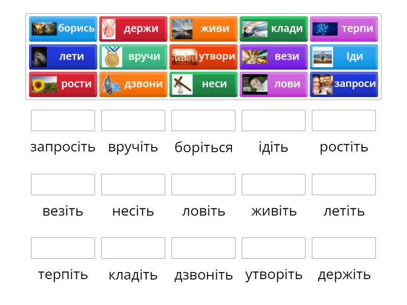Іди - ідіть, клади - кладіть, лети - летіть, рости - ростіть, неси - несіть, запроси - запросіть, вези - везіть, дзвони - дзвоніть, держи - держіть, вручи - вручіть, живи - живіть, лови - ловіть, терпи - терпіть, борись - боріться, утвори - утворіть,