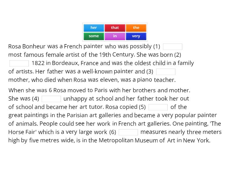 Rosa Bonheur was a French painter who was possibly (1) ____ most famous female artist of the 19th Century. She was born (2) ____ 1822 in Bordeaux, France and was the oldest child in a family of artists. Her father was a well-known painter and (3) ____ mother, who died when Rosa was eleven, was a piano teacher. When she was 6 Rosa moved to Paris with her brothers and mother. She was (4) ____ unhappy at school and her father took her out of school and became her art tutor. Rosa copied (5) ____ of the great paintings in the Parisian art galleries and became a very popular painter of animals. People could see her work in French art galleries. One painting, 'The Horse Fair' which is a very large work (6) ____ measures nearly three meters high by five metres wide, is in the Metropolitan Museum of Art in New York.