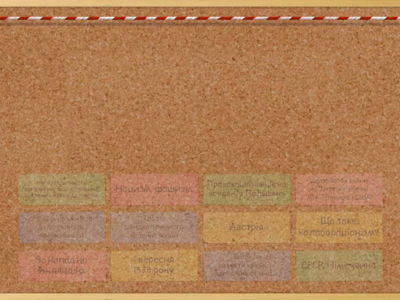 Несправедливість Версальсько-Вашингтонської системи мирних договорів - Назвіть одну із причини Другої світової війни, Нацизм, фашизм - Назвіть ідеології, які сформувались напередодні війни, Пообіцяв вивести країну із економічної кризи - Чому Гітлер прийшов до влади у Німеччині? Що він пообіцяв німцям?, Австрія - На яку країну Гітлер напав спочатку, до розв'язання Другої світової війни?, СРСР, Німеччина - Які країни винні у розпалюванні Другої світової війни?, За напад на Фінляндію. - За що СРСР виключили з Ліги Націй?, Теорія швидкоплинного ведення війни - Що таке бліцкриг?, 1 вересня 1939 року - Коли розпочалася Друга світова війна?, Провокація німців на кордоні з Польшею - Що таке гляйвіцька провокація?, Це початок війни на Тихому океані між Японією і США - Що ви знаєте про Перл-Гарбор?, У 1945 р. на ці міста було скинуто ядерні бомби - Що ви знаєте про Хіросіму та Нагасакі у період Другої світової війни?, Що таке колабораціонізм? - Співпраця з ворогом,