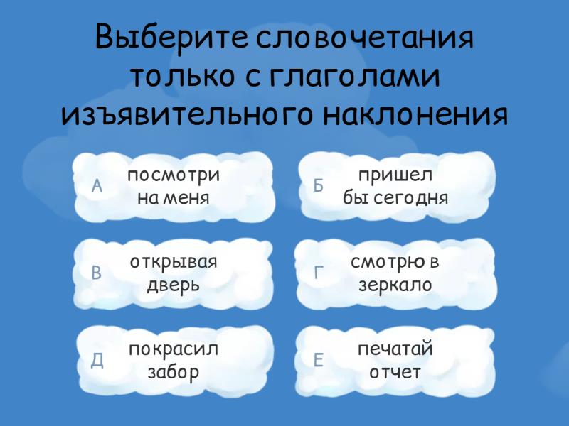 1) Выберите словочетания только с глаголами изъявительного наклонения a) посмотри на меня b) пришел бы сегодня c) открывая дверь d) смотрю в зеркало e) покрасил забор f) печатай отчет 2) Выберите глаголы изъявительного наклонения только прошедшего времени a) приготовлю суп b) прочитай рассказ c) имевши крупную сумму d) проиграл всё e) вышиваю крестиком f) прилагая усилия 3) Выберите глаголы изъявительного наклонения только будущего времени a) присмотрю себе очки b) получил бы премию c) присмотри себе очки d) получит премию e) полетит в отпуск f) подскажите который час 4) Выберите словочетания только с причастиями a) отброшенный назад b) сломленный воин c) мрачный вид d) выслушав историю e) обрекая на позор f) смертельный номер 5) Выберите словосочетания только с деепричастиями a) откупорив банку b) получивший абонимент c) иди домой d) напевая песню e) хлопая ресницами f) заправь постель