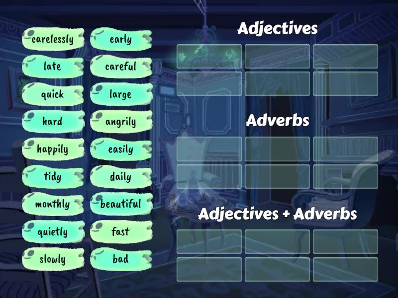 Adjectives: bad, quick, tidy, large, careful, beautiful, Adverbs: angrily, easily, quietly, carelessly, slowly, happily, Adjectives + Adverbs: hard, fast, early, daily, late, monthly,