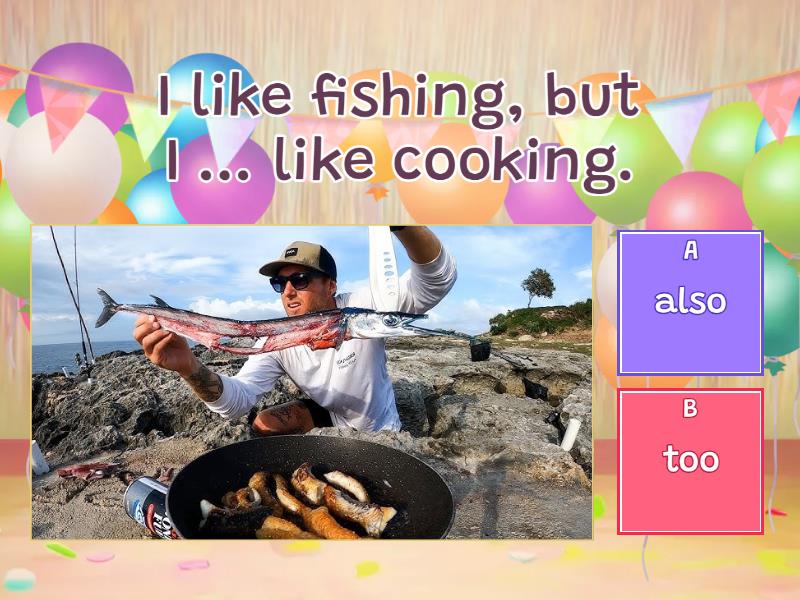 1) I like fishing, but I ... like cooking. a) also b) too 2) I have got a tablet and headphones at home. I have got a laptop ... a) also b) too 3) I love pizza, and I love ice cream ...! a) also b) too 4) I want to see that film ..., it looks really interesting. a) also b) too 5) My friend is good at math, and I'm ... good at it. a) too b) also 6) I can play the guitar ..., not just sing. a) too b) also 7) I love riding a bike ...! a) too b) also