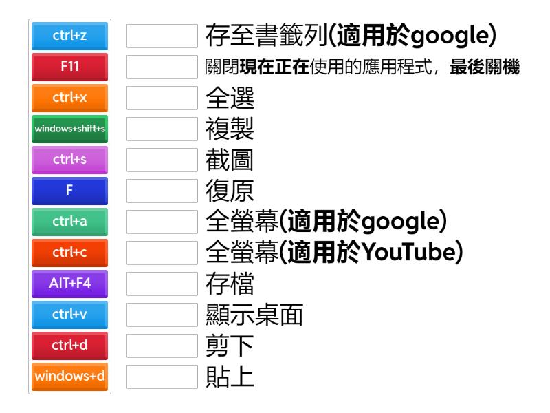 ctrl+c - 複製, ctrl+v - 貼上, ctrl+x - 剪下, ctrl+z - 復原, ctrl+s - 存檔, ctrl+a - 全選, ctrl+d - 存至書籤列(適用於google), windows+d - 顯示桌面, windows+shift+s - 截圖, F11 - 全螢幕(適用於google), F - 全螢幕(適用於YouTube), AIT+F4 - 關閉現在正在使用的應用程式,最後關機,