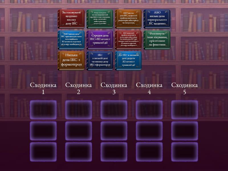 Сходинка 1 : Низька доза ІКС + формотерол , АБО низька доза ІКС при використанні інгаляційного В2-агоніста короткої дії в міру необхідності; , Сходинка 2 : ІКС в низькій дозі чи низьку дозу ІКС+формотерол, АБО щоденний прийом антагоніста репепторів лейкотрієну чи низька доза ІКС при використанні інгаляційного В2-агоніста короткої дії в міру необхідності , Сходинка 3: До ІКС в низькій дозі додати В2-агоніст триволії дії, Якщо контроль все ще неадекватний спробуйте інше лікування, напр., антагоніст лейкотрієнових рецепторів+ІКС , Сходинка 4: Середня доза ІКС+В2-агоніст тривалої дії , АБО висока доза ІКС, щоденний прийом анатгоніста рецепторів лейкотрієну чи тіотропіум; , Сходинка 5 : Застосовувати щоденно високу дозу ІКС , Розглянути інше лікування, орієнтоване на фенотипи , АБО низька доза переорального КС щоденно,