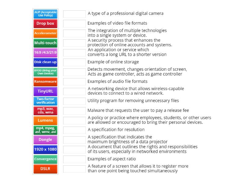 Disk clean up - Utility program for removing unnecessary files, Ransomware - Malware that requests the user to pay a release fee, Two-factor verification - A security process that enhances the protection of online accounts and systems., Dongle - A networking device that allows wireless-capable devices to connect to a wired network., Multi-touch - A feature of a screen that allows it to register more than one point being touched simultaneously, TinyURL - An application or service which converts a long URL to a shorter version, Convergence - The integration of multiple technologies into a single system or device., AUP (Acceptable Use Policy) - A document that outlines the rights and responsibilities of its users, especially in networked environments, BYOD (Bring your Own Device) - A policy or practice where employees, students, or other users are allowed or encouraged to bring their personal devices., Drop box - Example of online storage, mp4, mpeg, asf, wmv, avi - Examples of video file formats, mp3, wav, cda, wma - Examples of audio file formats, DSLR - A type of a professional digital camera, 16:9 /4:3/21:9 - Examples of aspect ratio, Lumens - A specification that indicates the maximum brightness of a data projector, 1920 x 1080 - A specification for resolution, Accelerometer - Detects movement, changes orientation of screen, Acts as game controller, acts as game controller,