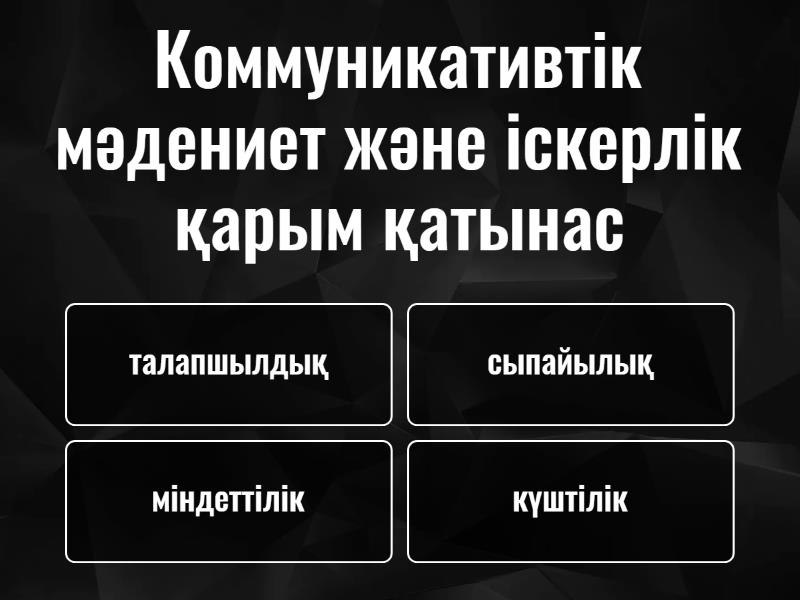 1) Коммуникативтік мәдениет және іскерлік қарым қатынас a) талапшылдық b) сыпайылық c) міндеттілік d) күштілік 2) Әдептілік дегеніміз не? a) Дауысты көтеріп сөйлеу b) Қарсы пікір айтып, ұрыс шығару c) Әдеп сақтап, шектен аспау d) Тек өзінің пікірін айту 3) Кішіпейілділікке қайсысы жатпайды? a) Басқаларға құрметпен қарау b) Адамның кемшілігін бетіне басу c) Намысына тимеу d) сыйлау 4) Іскерлік сөйлеудің басты көрсеткіштерінің бірі – a) Сөзі ұзақ болу b) Сөздік құрамда жаргондар қолдану c) Дауысты қатты шығару d) Тіл тазалығы, сөздің әсерлілігі 5) Іскерлік қарым-қатынас түріне жатпайтын нұсқаны көрсетіңіз: a) Іскерлік кеңес b) Телефонмен сөйлесу c) Досымен әңгімелесу d) Іскерлік хат 6) Корпоративтік қатынастың басты ерекшелігі не? a) Бәсекелестік b) Белгілі бір мақсат-міндет көзделуі c) уақыт үнемдеу d) эмоциямен сөйлесу 7) «Көпшілік алдындағы сөз» дегеніміз a) Кеңседе отыру b) Құпия хат алмасу c) Бір адаммен сөйлесу d) Шешендік өнерді сақтап, ақпаратты аудиторияға жеткізу 8) Іскерлік келіссөз» ұғымының мәні неде? a) Қызметкерді сынау b) Шешім қабылдау мақсатында пікір алмасу c) Қателікті табу d) дос табу