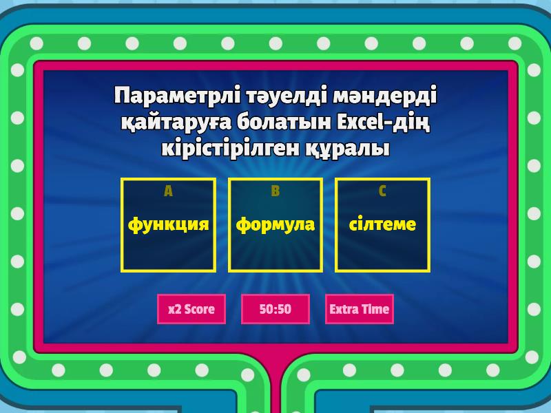 1) Параметрлі тәуелді мәндерді қайтаруға болатын Excel-дің кірістірілген құралы a) функция b) формула c) сілтеме 2) арифметикалық амалдарды орындауға және сандық мәндерді қайтаруға негізделген a) салыстыру операторы b) арифметикалық оператор c) мәтіндік оператор 3) деректерді салыстыруға және АҚИҚАТ немесе ЖАЛҒАН логикалық мәндерді қайтаруға арналған a) салыстыру операторы b) арифметикалық оператор c) мәтіндік оператор 4) Функция мен формуланы кірістіру үшін қай пернені басу қажет? a) b) c) 5) Орташа мәнін есептеу функциясы a) срзнач b) если c) сумм 6) қосынды мәнін есептеу функциясы a) срзнач b) если c) сумм 7) Формуланы көшіру барысында ұяшықтың адресі өзгеретін болса, онда ол ... сілтеме болады. a) салыстырмалы b) абсолютті c) аралас 8) Формуланы көшіру барысында ұяшықтың адресі өзгермейтін болса, онда ол ... сілтеме болады. a) салыстырмалы b) абсолютті c) аралас 9) Ұяшық диапазондарымен жұмыс істеу әрекеттері a) өшіру, кірістіру, көшіру, ауыстыру, сұрыптау b) ақпараттар ағымы, ақпараттардың жойылуы, алаяқтық c) ақпаратты сақтау, қорғау 10) Мәтіндік жолдағы символдар саның есептейтін функцияны көрсет a) ЕСЛИ() b) ДЛСТР() c) ПСТР() 11) Шартқа негізделген функция? a) НАЙТИ() b) ВЫБОР() c) ЕСЛИ() 12) Мәтінді өңдеуге мүмкіндік береді ... a) мәтіндік функциялар b) логикалық функциялар c) өзгерту функциялар
