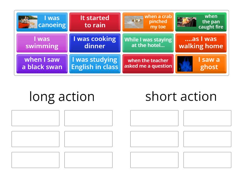 long action: I was swimming, ....as I was walking home, While I was staying at the hotel..., I was cooking dinner, I was studying English in class, I was canoeing, short action: when I saw a black swan, It started to rain, when a crab pinched my toe, I saw a ghost, when the pan caught fire, when the teacher asked me a question,
