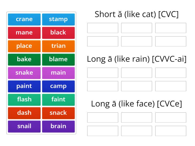 Short ă (like cat) [CVC]: flash, black, camp, snack, dash, stamp, Long ā (like rain) [CVVC-ai]: brain, snail, paint, main, trian, faint, Long ā (like face) [CVCe]: snake, mane, crane, place, bake, blame,