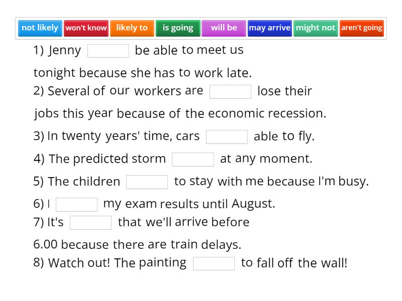 1) Jenny ____ be able to meet us tonight because she has to work late. 2) Several of our workers are ____ lose their jobs this year because of the economic recession. 3) In twenty years' time, cars ____ able to fly. 4) The predicted storm ____ at any moment. 5) The children ____ to stay with me because I'm busy. 6) I ____ my exam results until August. 7) It's ____ that we'll arrive before 6.00 because there are train delays. 8) Watch out! The painting ____ to fall off the wall!