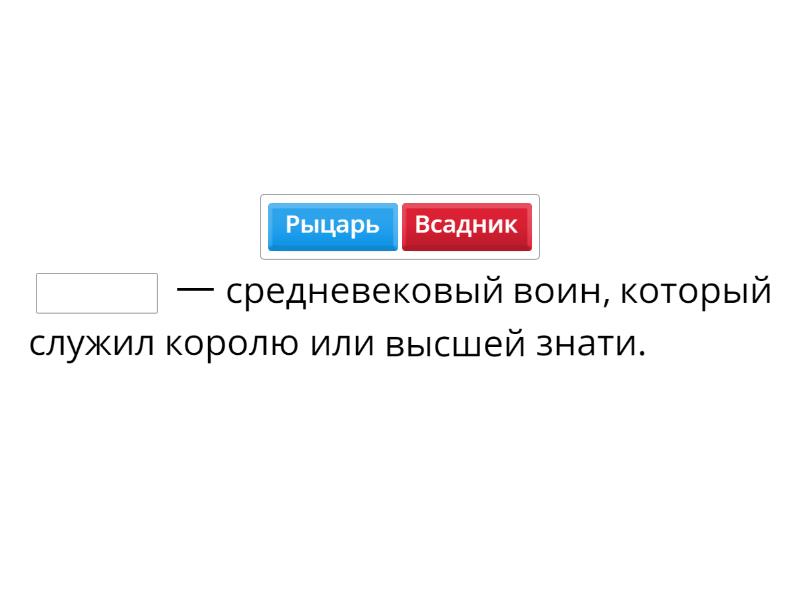 ____ — средневековый воин, который служил королю или высшей знати. Рыцарские ____ — состязания между рыцарями на силу, ловкость и их боевые умения. Замки — это защитные крепости, которые стояли ____ Средневековые замки принадлежали ____ Жители европейских городов в Средневековье занимались ____ К изобретениям Средневековья относятся: ____, механические часы, очки, песочные часы, ветряная и водяная мельницы. Средневековье — период в истории человечества, который начался в ____ веке нашей эры и продолжался до XV века.