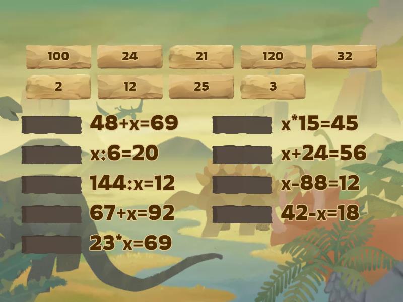 32 - х+24=56, 24 - 42-х=18, 21 - 48+х=69, 100 - х-88=12, 25 - 67+х=92, 2 - 23*х=69, 3 - х*15=45, 12 - 144:х=12, 120 - х:6=20,