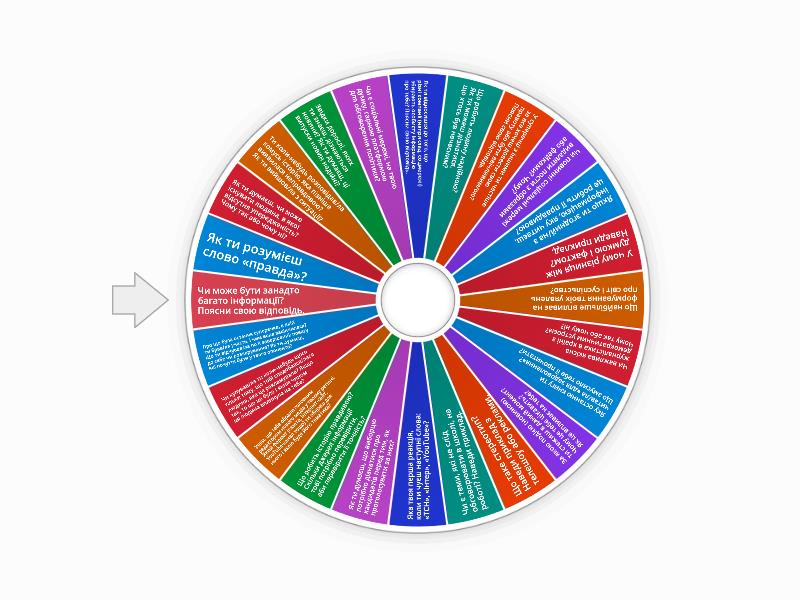 Як ти розумієш слово «правда»?, Як ти думаєш, чи може існувати людина, в якої відсутня упередженість? Чому так або чому ні?, Ти коли-небудь розповідав/ла комусь історію, яка пізніше виявилася неправдивою? Як ти вийшов/ла з ситуації?, Звідки дорослі, яких ти знаєш, дізнаються новини? Як ти думаєш, ці випуски новин надійні?, Чи є соціальні мережі, на твою думку, гарною платформою для обговорення політики?, Як ти відносишся до того, що різні компанії (наприклад, соцмережі) збирають особисту інформацію про тебе? Поясни свою відповідь., Що робить людину надійною? Як ти можеш дізнатися, що хтось був нечесним?, У суперечці з іншими ти частіше за все хочеш довести свою правоту або бути ввічливим/ою? Поясни свою відповідь., Чи повинні соціальні мережі видаляти пости з образами або фейками? Чому?, Якщо ти згодний/на з інформацією, яку читаєш, це робить її правдивою?, У чому різниця між думкою і фактом? Наведи приклад., Що найбільше впливає на формування твоїх уявлень про світ і суспільство?, Чи важлива якісна журналістика в країні з демократичним устроєм? Чому так або чому ні?, Яку останню книгу ти читав/ла «для задоволення»? Що змусило тебе її прочитати?, За якою подією (новиною) ти стежиш в даний момент? Чому це тебе цікавить? Як це впливає на тебе?, Що таке стереотип? Наведи приклад з телешоу або реклами., Чи є теми, які не слід обговорювати в школі, на роботі? Наведи приклад., Яка твоя перша реакція, коли ти чуєш наступні слова: «ТСН», «Інтер», «YouTube»?, Як ти думаєш, що виборцю потрібно дізнатися про кандидатів перед тим, як проголосувати за них?, Що робить історію правдивою? Скільки джерел інформації тобі потрібно перевірити, аби перевірити її точність?, Уяви, що тебе обрали головним редактором нового медіа у твоєму регіоні. Який формат (газета, інтернет-сайт, YouTube-канал тощо) ти обереш для нього і якою буде його тематика?, Чи купував/ла ти коли-небудь щось тільки тому, що тобі сподобався/лася людина, яка це рекламувала? Якщо так, то що це було і яким чином ця людина вплинула на тебе?, Про що була остання суперечка, в якій ти брав/ла участь, і чим вона закінчилася? Що ти відчував/ла по її завершенні: повагу до себе чи розчарування? Як ти думаєш, які почуття були у твого опонента?, Чи може бути занадто багато інформації? Поясни свою відповідь..
